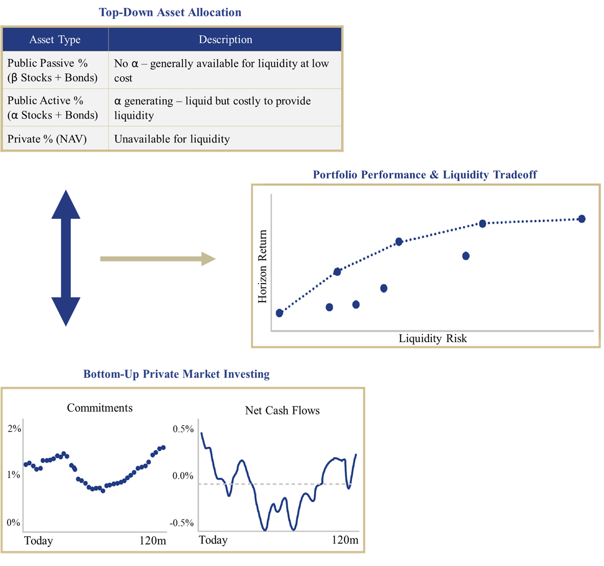 - What should be the desired allocations (public vs. private, public passive vs. public active) given the investor’s liquidity risk tolerance?