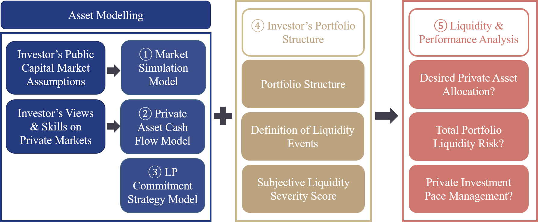 First, it begins by simulating the returns and risk of public and private assets in a multi-asset portfolio. The simulation can incorporate an investor’s own capital market assumptions. It also allows investors to express their views on future private asset performance (relative to public assets) and their fund-selection skills which can be an important performance driver. In addition, the framework introduces cash flow modelling which is consistent with and responsive to the underlying market environment.