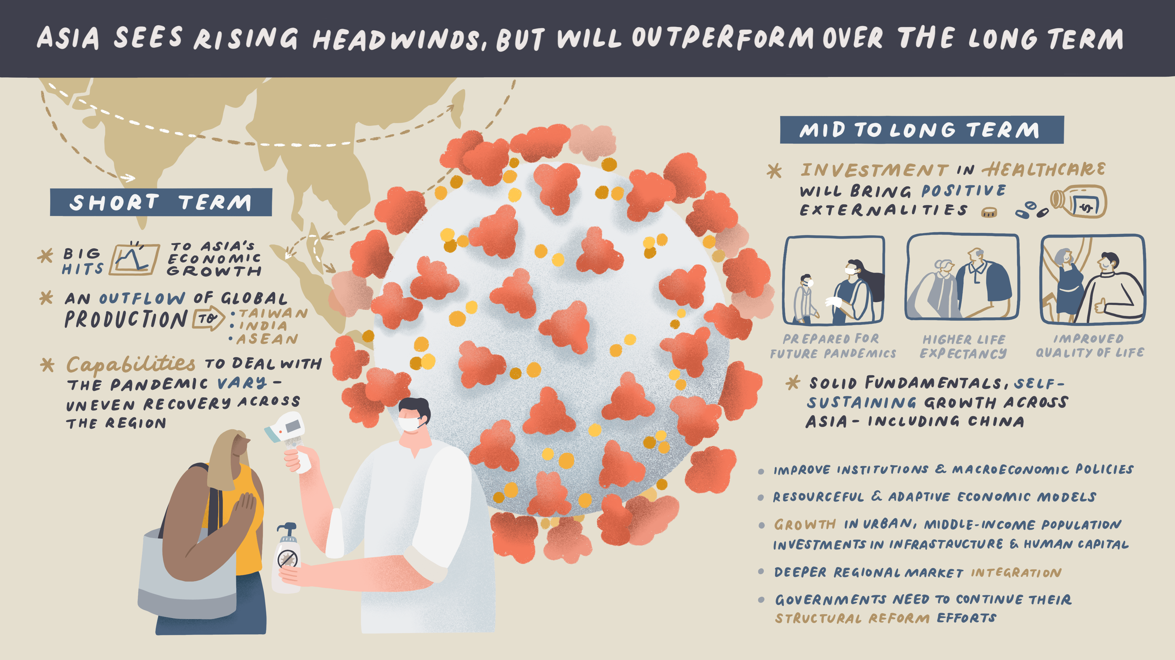 Asia’s economic growth was severely affected by COVID-19, and its recovery will be gradual. However, over the long term, Asia can continue to derive solid growth from: urbanisation and middle-income growth, investments in infrastructure and human capital, and deeper regional integration of economies and capital markets. Structural reforms, to support this growth as well as the adaptability of Asian economies, are key.