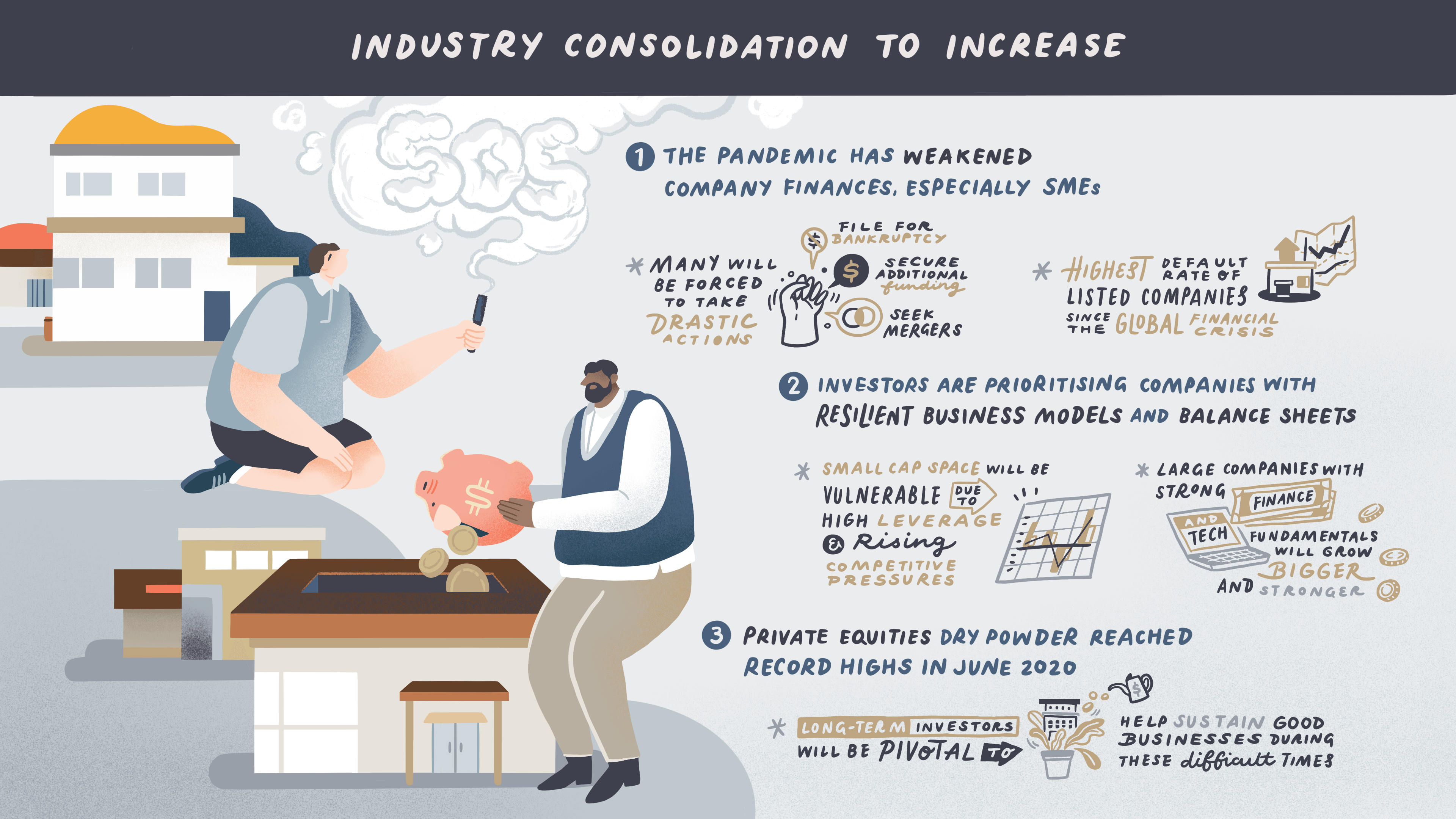 COVID-19 has drastically weakened the finances of many companies, particularly small- to medium-sized ones. With investors showing a strong preference for companies with more resilient balance sheets and business models, smaller companies may be particularly vulnerable to consolidation. Large companies, with stronger financials and technological advantages, are likely to be better positioned to become even bigger and stronger.