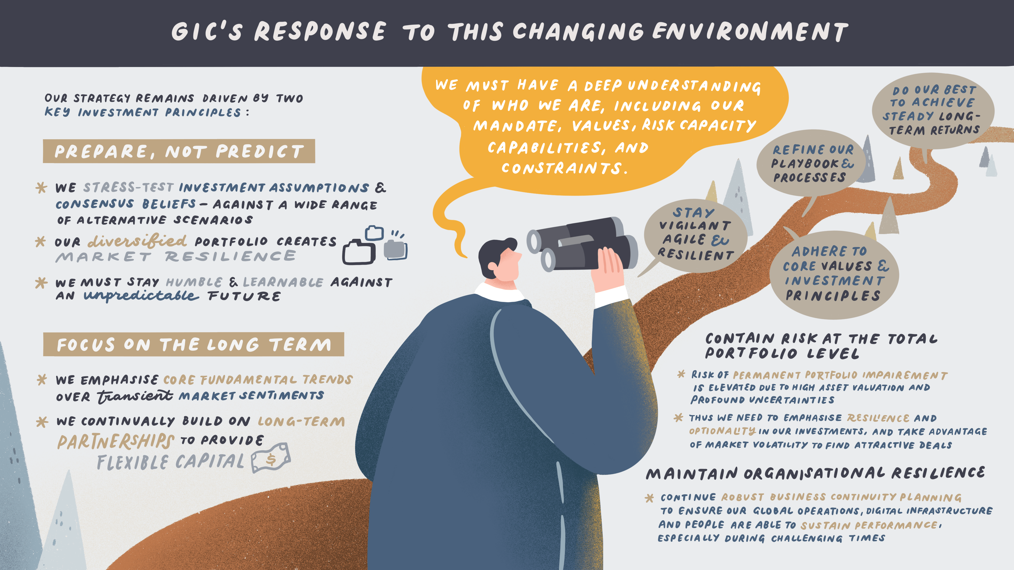 These shifts will likely result in lower future returns and increased volatility in the markets, and navigating this environment will require vigilance, agility, and resilience for the journey ahead. At GIC, our approach is guided by our core values and two key investment principles – Prepare, not Predict, and Focus on the Long Term.