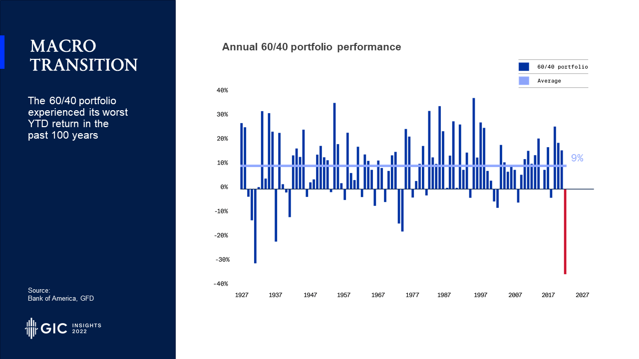 The 60/40 portfolio has just experienced its worst performance in the last century. Both bonds and equities sold off. There has been a big jump in the correlation between them, eliminating the portfolio diversification benefit.