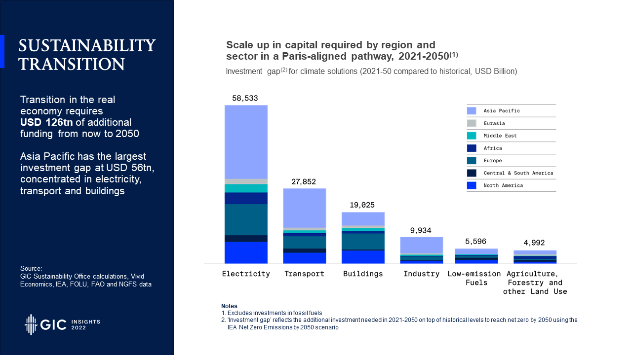 - The role of climate finance was front and centre at COP27. Based on the IEA’s “Net Zero Emissions by 2050” scenario, transition in the real economy will require an additional US$126 trillion from now until 2050, and almost half of this money is needed in Asia-Pacific.