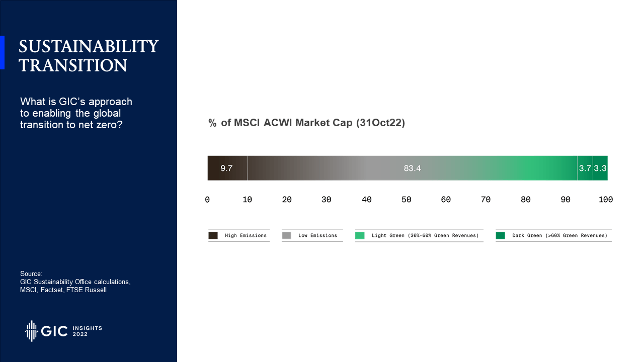 - At the other end of the spectrum are green assets deriving a high percentage of their revenues from green activities such as renewable energy and other decarbonisation solutions. GIC has been quite active in investing in this area, but as you can see from the Index proxy, these assets only make up a small part of the investment universe. We need to help to grow this. GIC would like to play a role in developing the ecosystem, including the off-take market and creating customer demand for climate solutions such as green hydrogen.