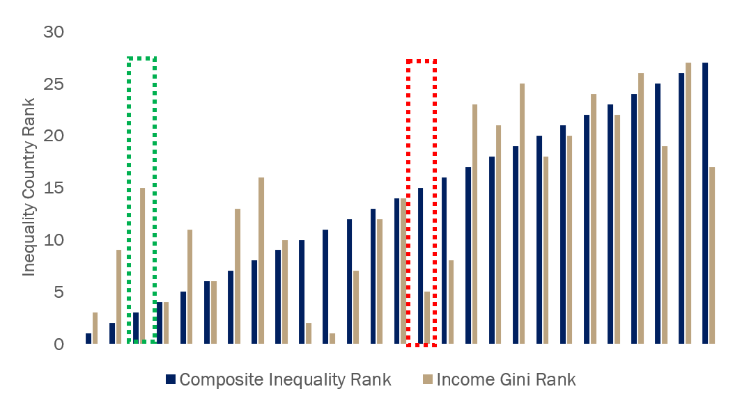 For example, a middling performer on the income Gini coefficient can be one of the best performers on the CII (example highlighted in the green box). This is because the country’s average performance in income inequality is more than offset by strongly positive showings in wealth distribution and access to opportunities, particularly in the areas of intergenerational mobility and gender pay gaps.