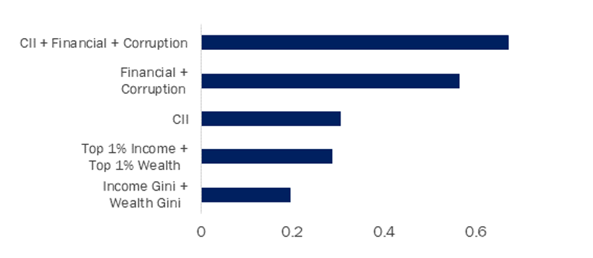 The combination of the CII, together with measures of financial globalisation and corruption perception, explained the rise of populism well (with a high r-squared of 0.7). As seen in Exhibit 3, the CII explained rising populism better than other measures of inequality such as income and wealth Gini coefficients.