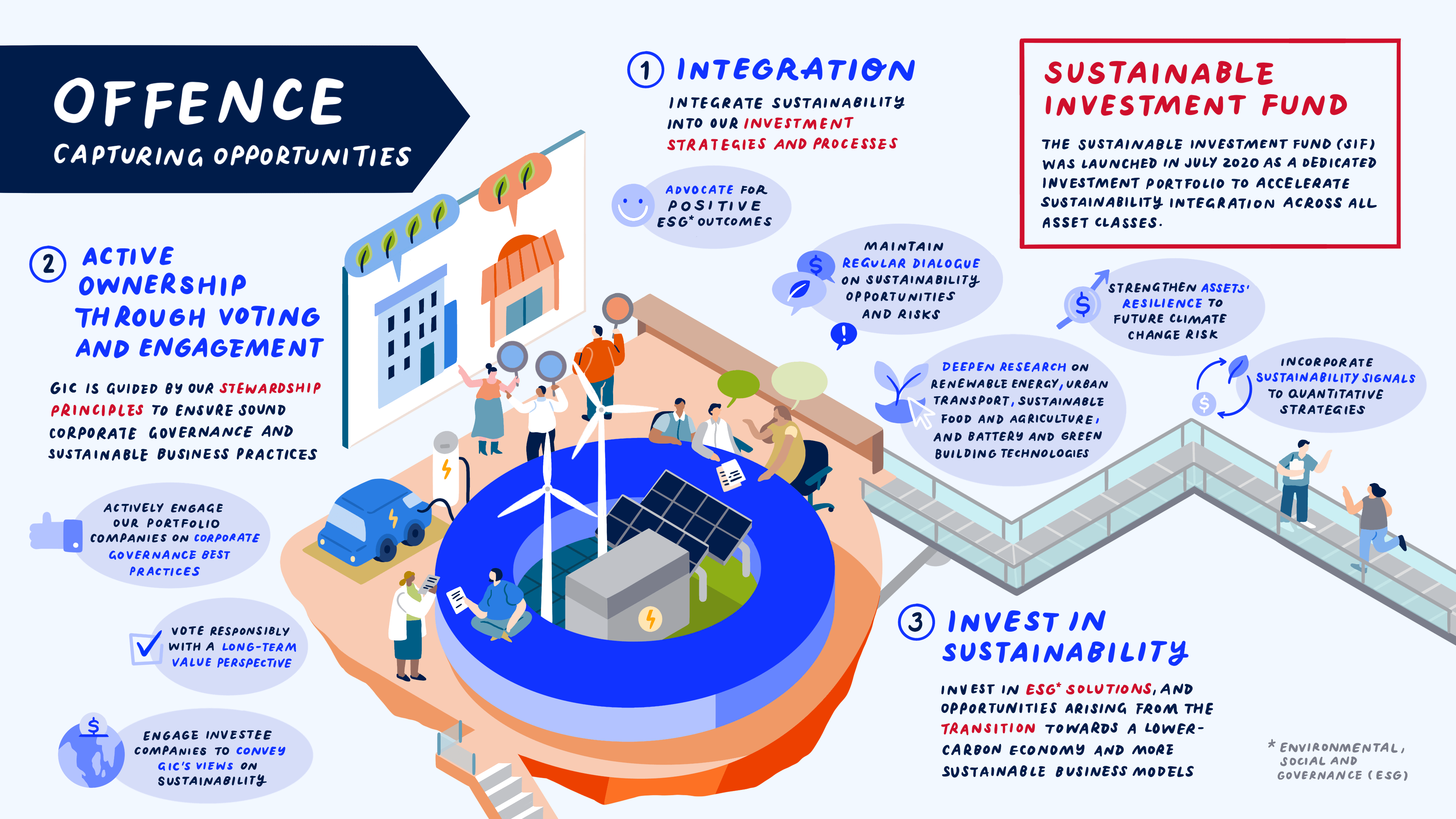 Offence focuses on capturing opportunities by integrating sustainability into our investment processes, actively engaging investee companies towards more sustainable outcomes, investing in ESG solutions and opportunities, actively greening our assets to be resilient to climate change risks, and incorporating sustainability signals into quantitative strategies.