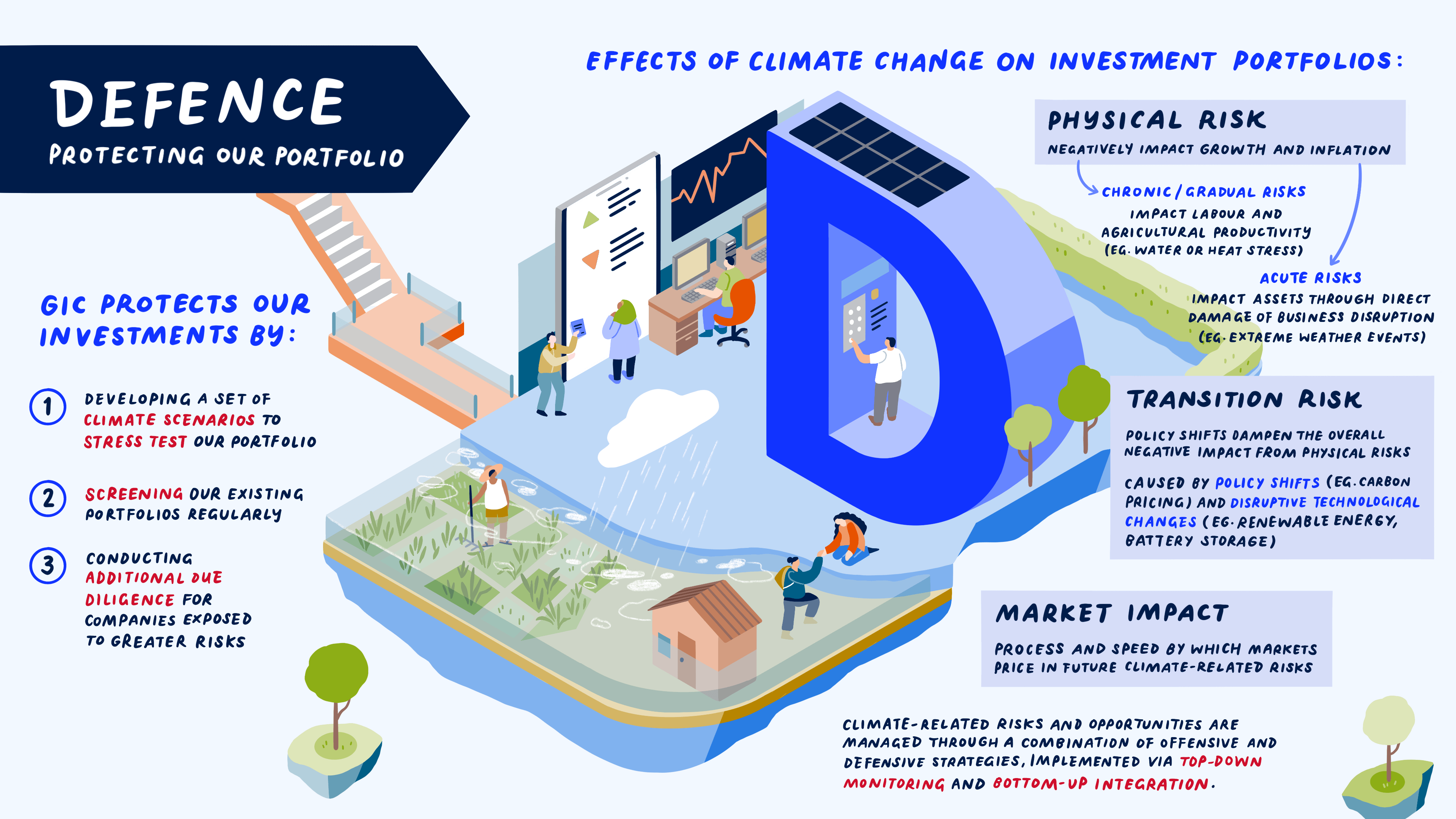 Defence refers to protecting our portfolio, as sustainability issues across the domains of environmental, social and business governance all have the potential to pose investment risks. GIC protects our investments by developing climate scenarios to stress-test our portfolio, regularly screening our portfolio for sustainability issues, and conducting additional due diligence for companies exposed to greater sustainability risks.