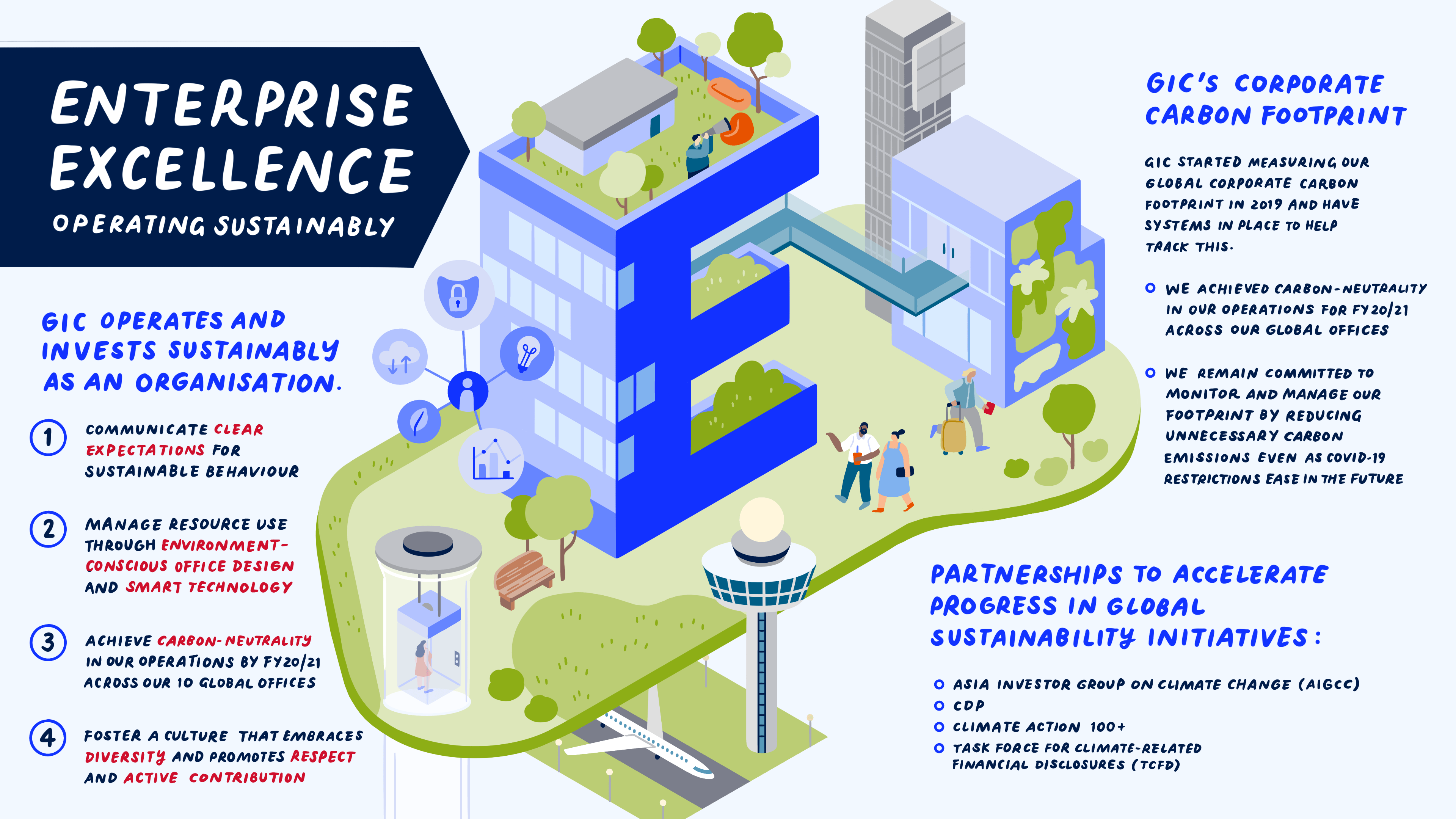 GIC believes that operating sustainably as an organization is as important as the way we invest. We achieve enterprise excellence by communicating clearly our expectations for sustainable behaviour to our business partners and staff, managing our resources to improve energy efficiency and achieve carbon-neutrality across our global offices, and fostering a culture that embraces diversity and respect, and active contribution to society.